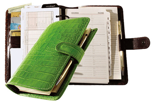 Features :- Glazed Italian crocodile print on top-grain cowhide cover. Sturdy snap closure. Zippered compartment, ID window and credit-card slots. Pen loop (no pen included). Week-at-a-view spiral bound calendar and 13-tab spiral phone directory included.